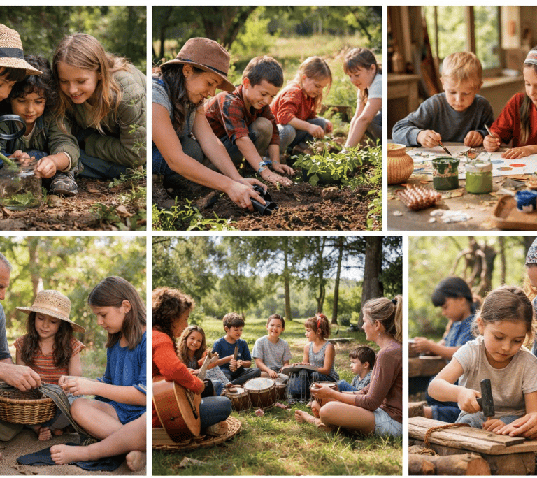 Here, children grow up within a multi-generational village, moving freely between open natural spaces, guided and self-directed learning, and workshops in art, creativity, gardening, music, movement, and ancient crafts.