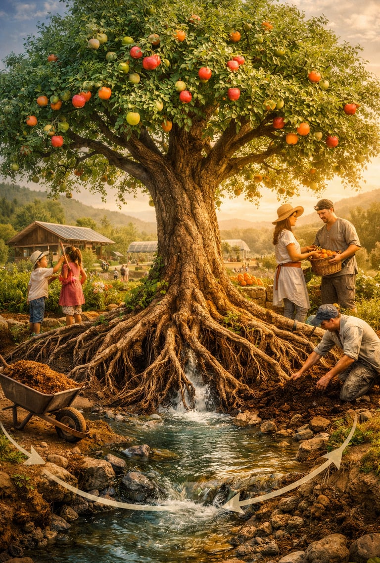 Tree of Life villages are designed to hold these three flows in conscious balance, allowing capital to move where it serves life rather than where it merely accumulates.