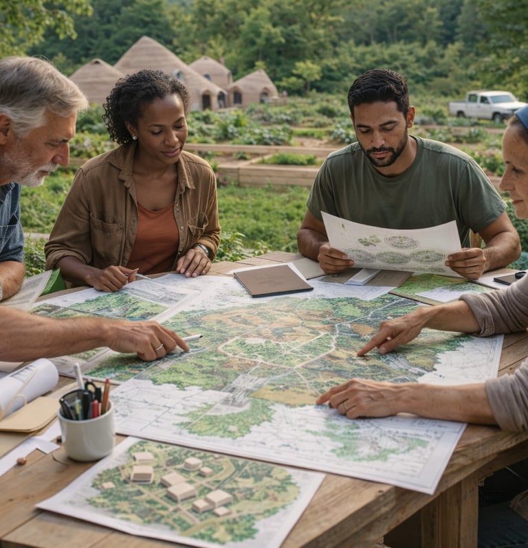 Defining the village model, governance principles, land criteria, and community structure—before physical development begins.